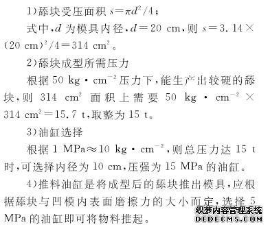 3、成型油缸和推料油缸 成型油缸根據(jù)舔塊表面積及成型時的適宜壓力而定,具體計算如下: