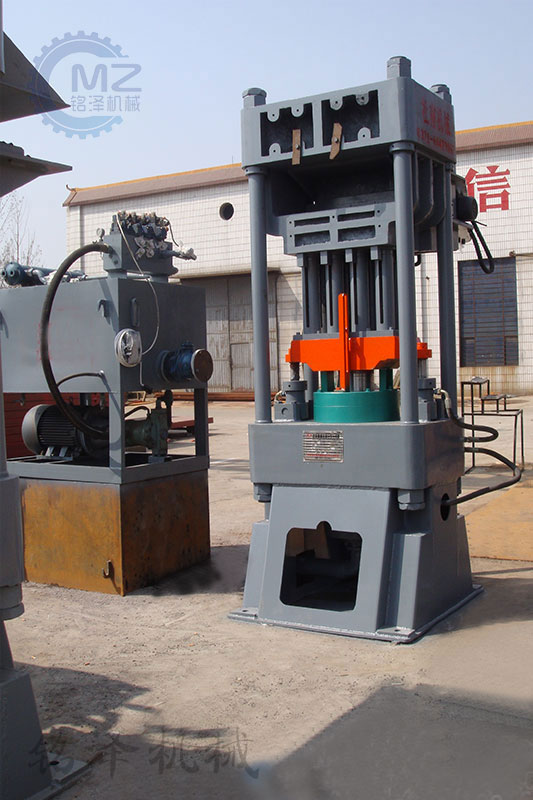 1、機架  機架由兩根槽鋼作為立柱,立柱上、中、下部焊接鋼板,分別作為上臺面、操作臺面和下臺面。上臺 面安裝成形油缸,下臺面安裝推料油缸,操作臺面安裝成型模具。