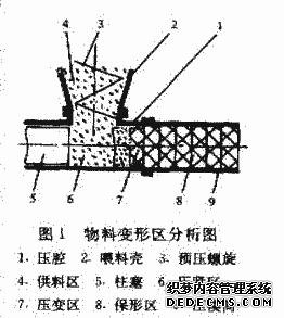 隨著柱塞的前移,物料進(jìn)入壓變區(qū)。在這一區(qū)域內(nèi),柱塞壓力急劇增大,進(jìn)一步排出物料間的氣體,物料發(fā)生塑性變形,相互貼緊、堆砌和鑲嵌粘接,形成餅塊,并推動(dòng)前面餅塊前移,密度達(dá)到最大,進(jìn)入到保形區(qū)。