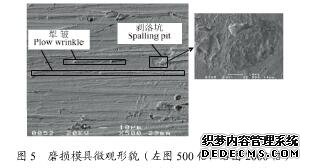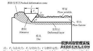 成型過程中,物料在模腔中主要受2個方向的作用力,平行于模腔的切向力和垂直于模具表面的法向力,物料中的硬磨粒在法向力作用下被壓入金屬表面,同時切向力推動磨粒運動,對金屬表面進行切削,這種作用與金屬切削加工或研磨相似,如圖所示;較軟的物料則在循環(huán)載荷下與模具表面突出部位或犁溝產(chǎn)生周期性的接觸,使得該部位金屬材料因反復塑變硬化而疲勞剝落,形成凹坑和疲勞裂紋,如圖5所示,但該現(xiàn)象在模具魔磨損過程中作用較弱。