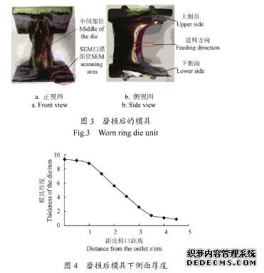 模具中間部位的磨損直接影響到壓輪和環(huán)模間的間隙,實際生產(chǎn)中主要通過調(diào)整間隙使磨損后的模具繼續(xù)工作,在間隙不能調(diào)整時模具失效,因此該處的磨損量非常關(guān)鍵,該型模具中間部位的極限磨損量為12mm。