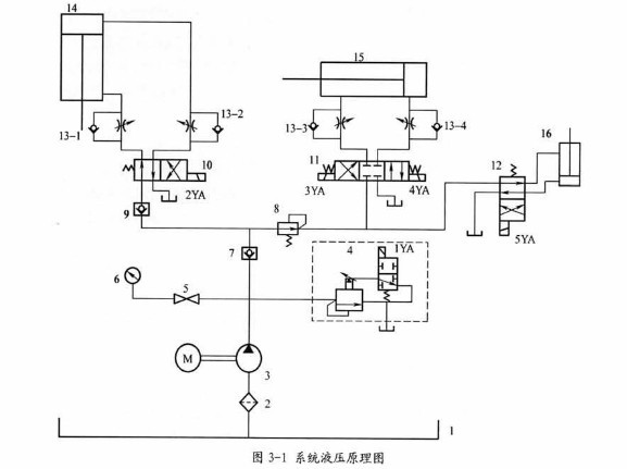 7.9—單向閥  8—減壓閥  10-12—電磁換向閥  13—單向節(jié)流閥  14—壓縮缸
