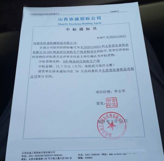 我公司順利中標山西協(xié)誠工程公司鹽磚壓塊機項目