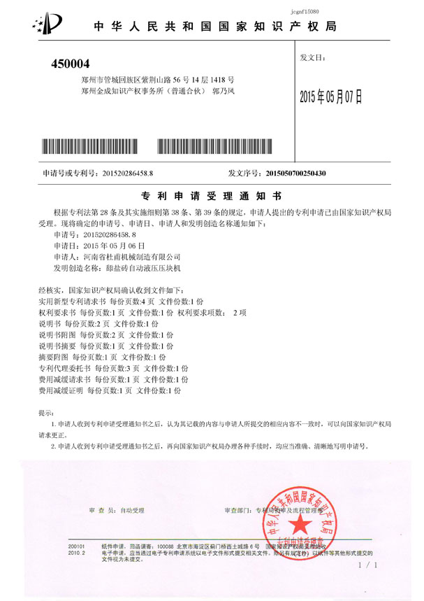 | B:舔鹽磚自動(dòng)液壓壓塊機(jī)專(zhuān)利受理通知書(shū) |